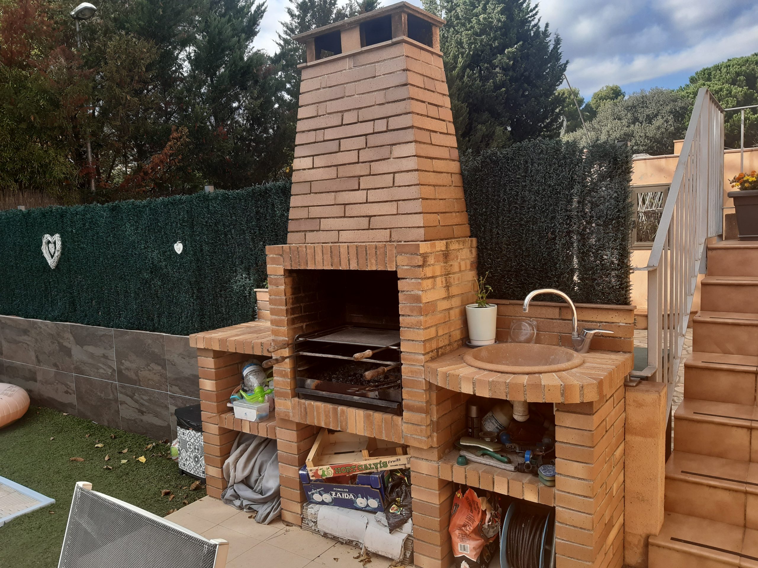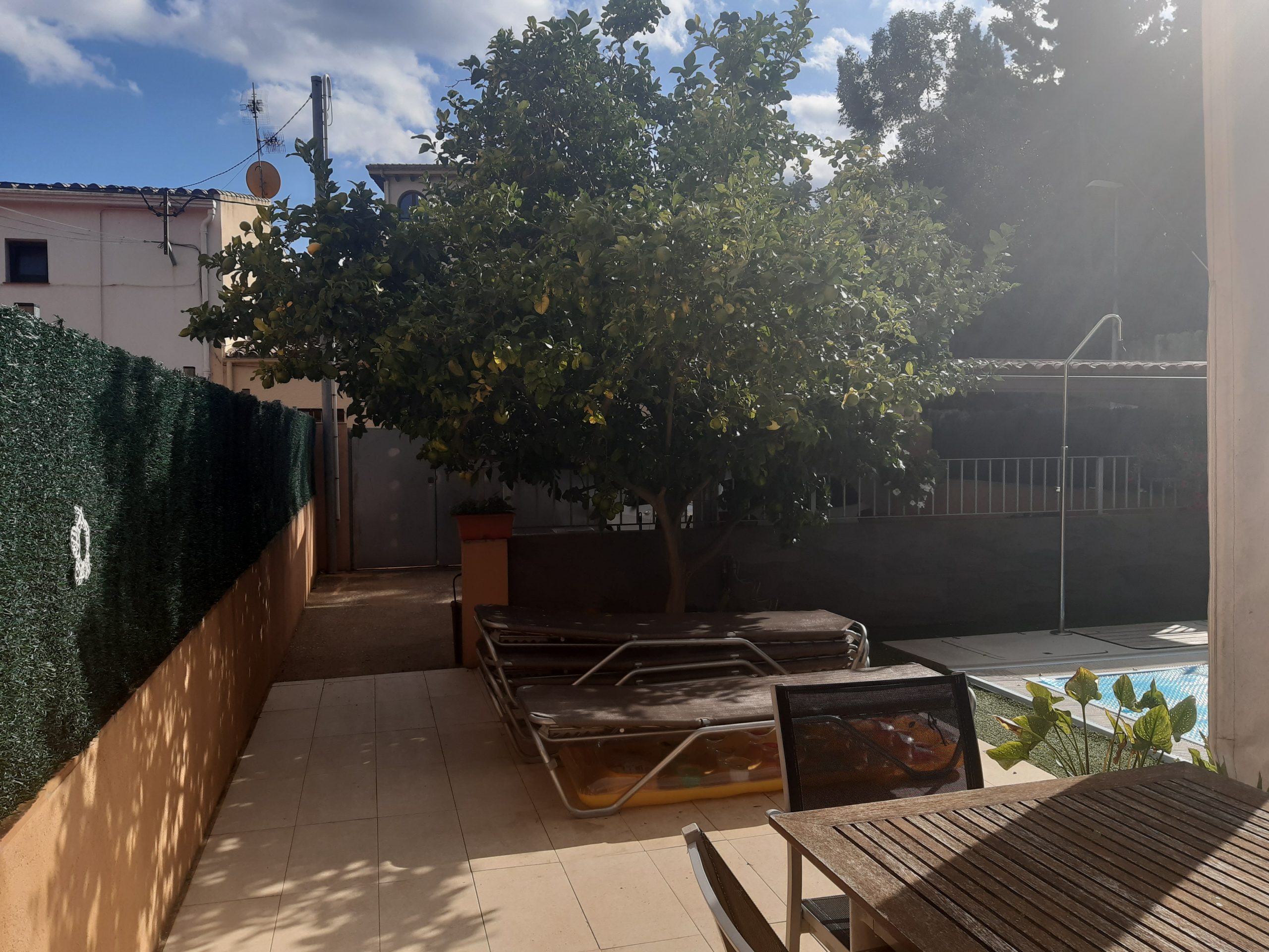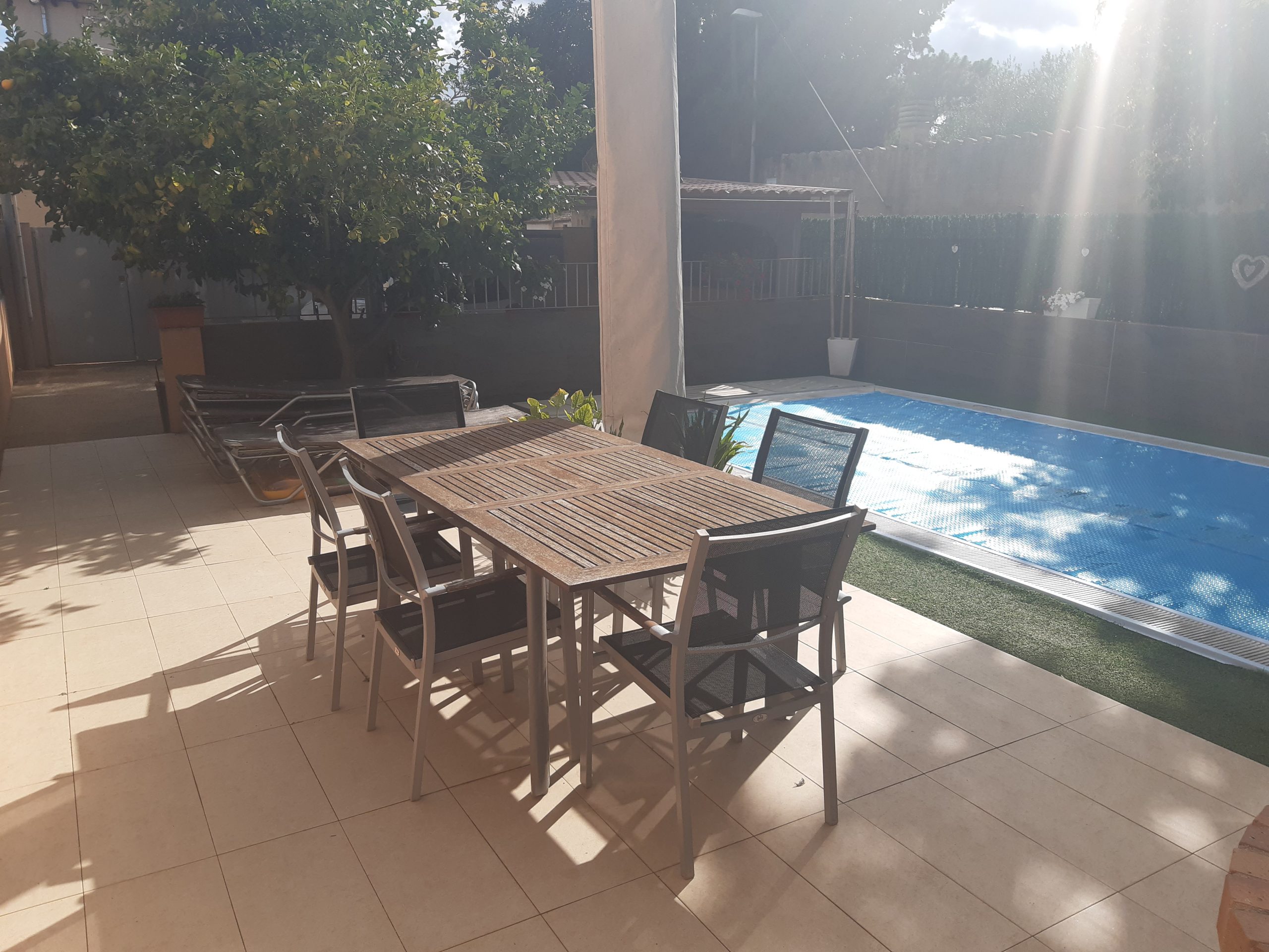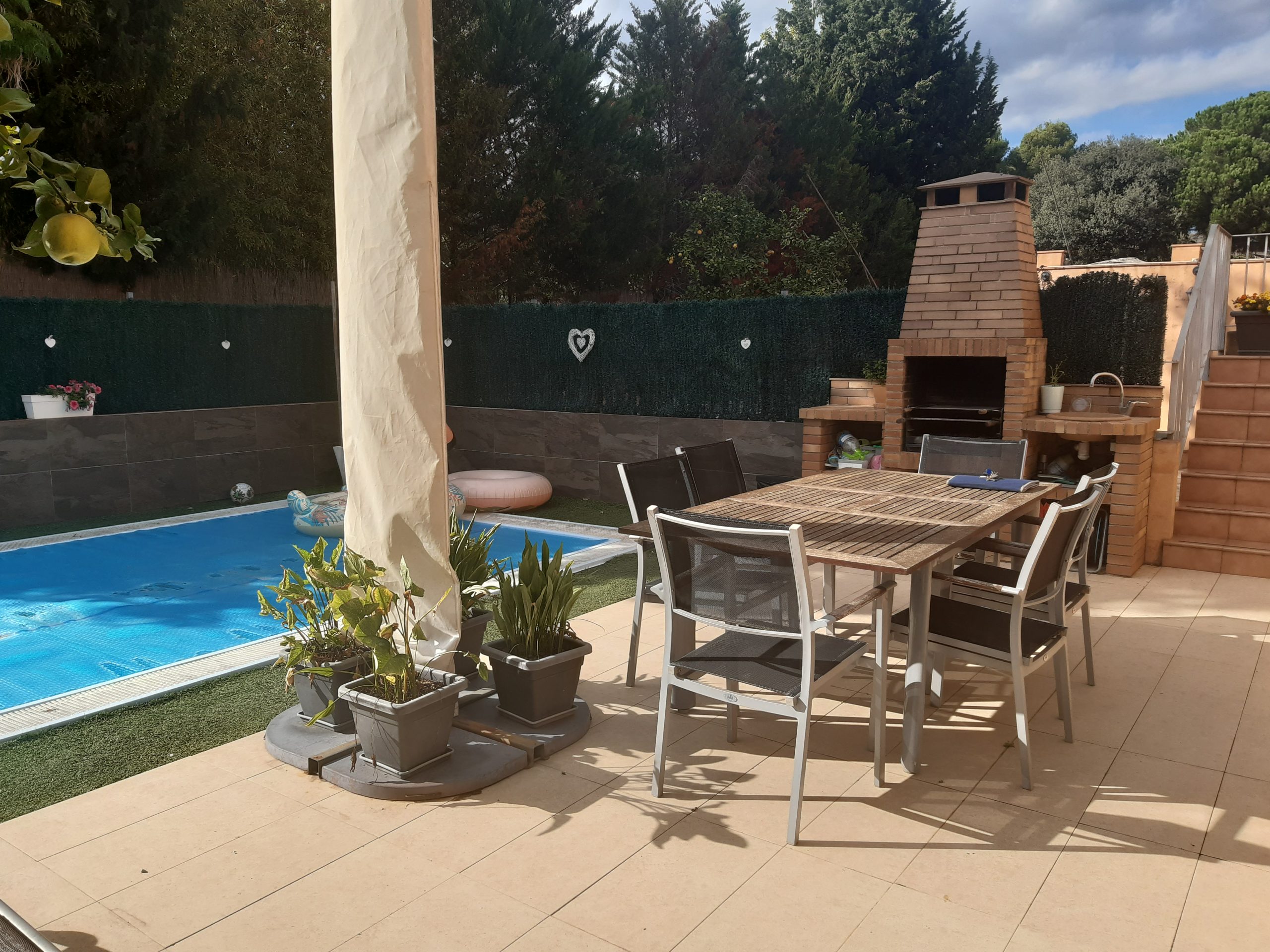 En la planta baja nos encontramos garaje cubierto para capacidad de dos coches, subimos las escaleras de la terraza y nos hallamos una piscina, con zona de barbacoa y terrazas.